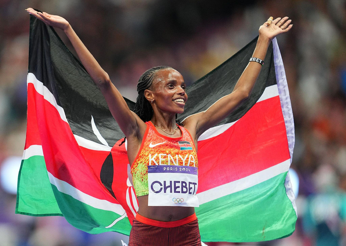 2024年8月9日,巴黎奥运会田径女子10000米冠军肯尼亚选手切贝特在比赛后庆祝。新华社记者 许畅 摄