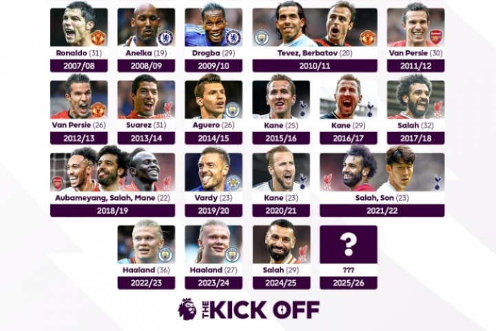 英超官推晒历年英超金靴得主:萨拉赫本赛季能否卫冕金靴?